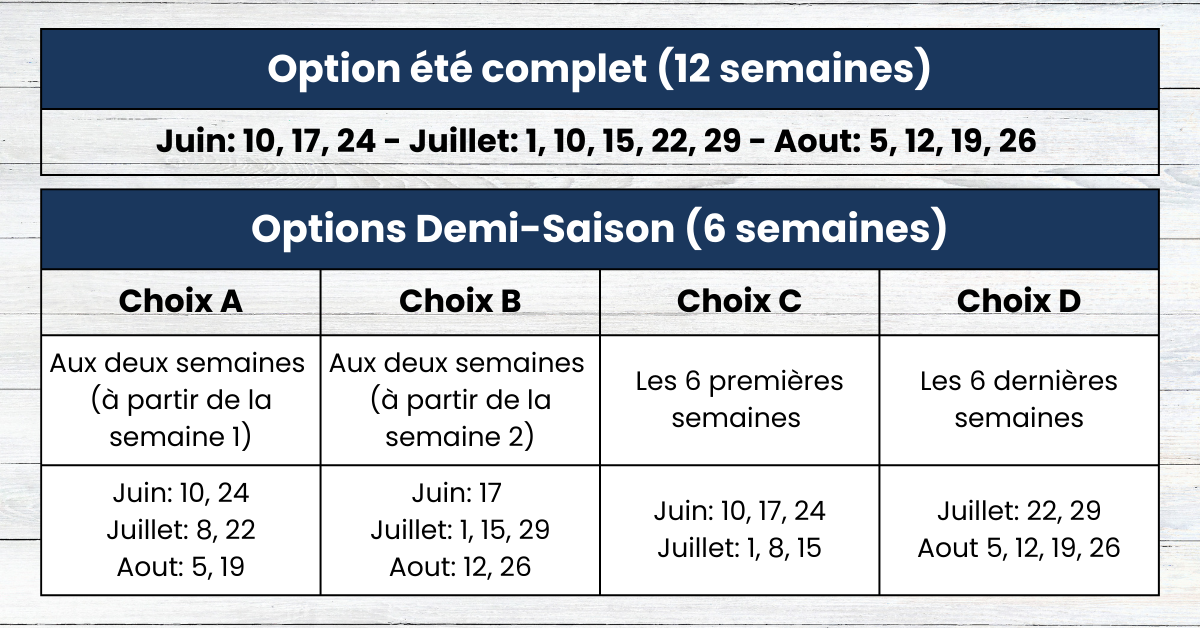 - 12 semaines: 10 juin au 26 août 2026 inclusivement.